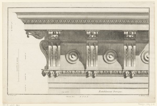 This is Placido Columbani's 'Kroonlijst met vazenmotief', or 'Cornice with vase motif'. This design offers us a glimpse into the world of 18th-century interior design. It reflects the era's fascination with classical forms and decorative embellishments. The symmetrical arrangement of vases and foliage evokes a sense of balance and harmony, which was highly valued. But beyond its aesthetic appeal, this cornice hints at the social structures of the time. Consider the skilled craftsmanship required to create such intricate details. These designs would have been commissioned by wealthy patrons. These spaces would have reflected the social standing and cultural aspirations of those who occupied them. The cornice, with its blend of classical motifs and ornate detailing, reminds us of the ways in which art and architecture have been used to shape our experiences of space and identity.