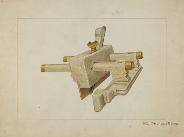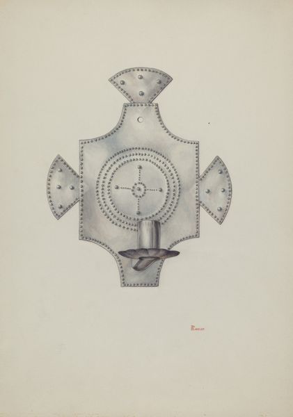 Curator: Well, hello there! Looking at this curious piece. It’s titled "Woman’s Spur," created around 1940 by Ethel Dougan. A drawing rendered in watercolor and colored pencil. What jumps out at you? Editor: Immediately, a contradiction. A spur, so often linked to masculine equestrian pursuits, being "for a woman." It poses interesting questions about gendered expectations of activity. Curator: Right? It feels almost satirical! Like a stage prop from a flamboyant rodeo act. And yet, the craftsmanship is so delicate. Notice the detailed floral work on the leather straps! Gives it a bizarre softness. Editor: Absolutely. And think of the historical context. During this time period, there was a shifting expectation and visibility of women, especially in ranching or traditionally male fields. This challenges how women performed or took ownership in such spaces. Curator: Yes! I wonder if Dougan had specific women in mind – maybe family, maybe just figures that she’d made up. To me, that pink floral appliqué kind of shouts femininity! Editor: I'm inclined to read it less as a celebration of femininity and more of a subversive critique, even a melancholic portrayal. A spur is meant to motivate an animal; perhaps here, we see a critique of the "motivational spurs" women faced. Think domesticity, conformity... Curator: A dark interpretation. I can see that! But the colors feel a bit too joyful for complete darkness, don’t they? There’s something very stylized about this whole presentation…the perspective. The lines. It reminds me a bit of costume design or perhaps advertisement layout… Editor: And doesn’t that, itself, reinforce the performance aspect? Aren’t the visuals designed to uphold, or disrupt, the image of women’s participation in, or ownership over, certain spaces? Curator: Fascinating! See, I’m coming around to your thinking now! What an intricate puzzle for a deceptively decorative object! Editor: Indeed! There's such a fascinating duality that encourages a dialogue between functionality and symbolism that is simultaneously complex and immediate.