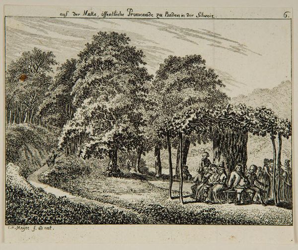 Curator: I’m drawn to how idyllic Johann Heinrich Meyer makes this landscape appear in "Near Molinetto on Lake of Locarno." The intricacy of the etching lends a serene quality. Editor: Yes, the scene feels almost staged, doesn't it? The figures in the foreground appear to be carefully placed, perhaps reflecting a romanticized view of rural life that ignores the labor and social stratification inherent in such environments. Curator: Perhaps. But notice how the trees frame the scene, like protective figures. Trees are often symbols of resilience, of deep-rooted history and connection to the land. In that light, the people look like caretakers. Editor: I can see that perspective. Still, those picturesque cottages nestled in the landscape can be read as symbols of a romanticized past, which often overlooks the realities of class and labor. It's a beautiful image, but one that needs to be viewed critically, particularly in regard to who benefits from such idyllic scenes. Curator: I appreciate that critical lens. I agree that art demands our interrogation. Editor: Indeed. Art always invites more than one interpretation.