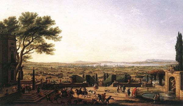 Editor: This is "Dresden from the Left Bank of the Elbe, Below the Fortification" painted in 1748 by Bernardo Bellotto, using oil paints. It feels almost documentary in its detail, yet softened by the light. What stands out to you about this painting? Curator: What's fascinating here is the depiction of Dresden not just as a picturesque city, but as a site of ongoing construction and daily life. Bellotto painted this during a period of rebuilding after the War of the Austrian Succession. You can see scaffolding on the church, indicating a city actively reshaping itself. Consider how the genre scene in the foreground, with ordinary people and carts, is juxtaposed with the grand cityscape. Does this choice speak to anything in particular for you? Editor: It’s like the artist is making a statement. Not just showing the city, but illustrating how its inhabitants are involved in its constant recreation. Almost a political commentary, framing their labour within the broader urban narrative? Curator: Precisely. And think about the intended audience. Bellotto was commissioned by the court; these images helped construct a particular vision of the city and its rulers. Do you think this image serves the people in foreground or the city elite more? Editor: Probably the city elite. It shows the "before" stage, reminding people of past conflict, and the "after" stage, a new city arising with the involvement of the populous, reflecting power, progress and control. The elites essentially want everyone to know it's through their beneficence. Curator: An interesting observation! Bellotto's precision offered an influential vision. We can clearly see the politics of imagery at play here. How has this changed your interpretation of landscape painting in general? Editor: I think it will change the way I look at these scenes, viewing landscape art with an eye to broader political and social contexts, rather than merely artistic composition. Curator: I’m glad it has.