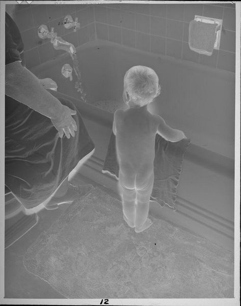 Editor: This photograph, titled "Untitled (baby next to bathtub)" by Lucian and Mary Brown, shows an intimate domestic scene. It strikes me as both tender and a little unsettling, especially with its stark contrasts. What draws your eye to this piece? Curator: It's the vulnerability, isn't it? The baby's tentative grip on the tub's edge, that near-blind trust. Makes you wonder, what are the unseen anxieties lurking beneath the surface of everyday life? Are the parents nearby and aware, or is the baby alone? Editor: That's a good point; it feels like a captured memory. Curator: Exactly, it's a fragment of a story, a ghost of a moment. And those are often the most powerful ones, wouldn't you agree? This photo freezes a transient instant into something profoundly human.