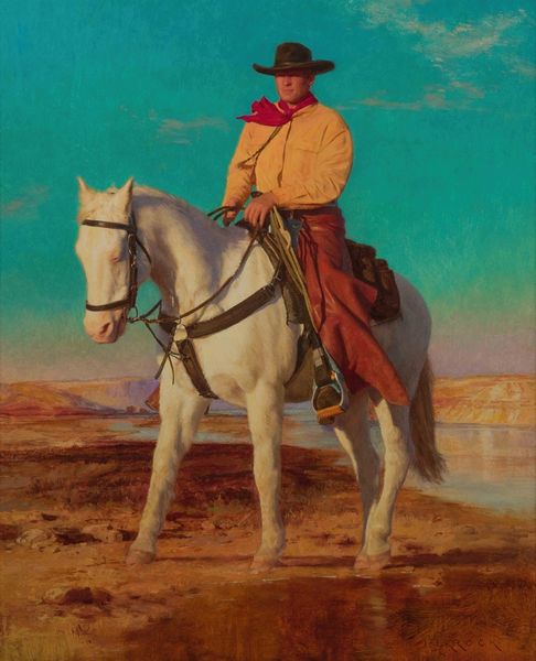 Curator: This painting is titled "The Lookout" by Frederic Remington, crafted in 1887 using oil paint. Editor: It's so sparse. Makes me think of solitude, like he's utterly alone in that landscape, or maybe guarding against something unseen on the horizon. Curator: The composition really enhances that feeling, doesn't it? The high vantage point, the sweeping vista... but your eye keeps returning to the rider and his horse, those small figures rendered so powerfully. The landscape seems to echo with silence, broken only by that stoic observer. Editor: It's the tonal qualities that do it for me. The palette, all those muted ochres and browns, mirroring the dryness of the terrain... even the light feels hazy, uncertain. You can almost taste the dust in the air. Is he weary, do you think, or vigilant? I love that ambiguous mood. Curator: Precisely. Remington captures that ambivalence through subtle choices. Notice the horse's posture; relaxed, yet alert. The rider too is at ease, a pipe in his mouth, but his gaze is fixed. He is at rest but ever watchful. This interplay highlights how one maintains both strength and resilience, ever prepared, even when momentarily at peace. Editor: The texture, particularly in the foreground rocks, also adds another dimension. You feel the grit under your fingers. It’s about a figure and the sublime vastness, that push-pull, human figure against untamed land. And honestly, doesn’t the scene evoke notions of manifest destiny, colonization and westward expansion, for all of its romantic qualities? Curator: Indeed. There's a whole conversation happening on the canvas between intimacy and immensity, rest and readiness, and ultimately humanity’s fraught relationship with nature. Thank you for bringing this nuanced perception to light! Editor: The painting reminds me how an artist’s vision helps one see things both anew and a bit clearer, don't you agree? Thanks, this was truly illuminating.