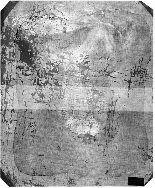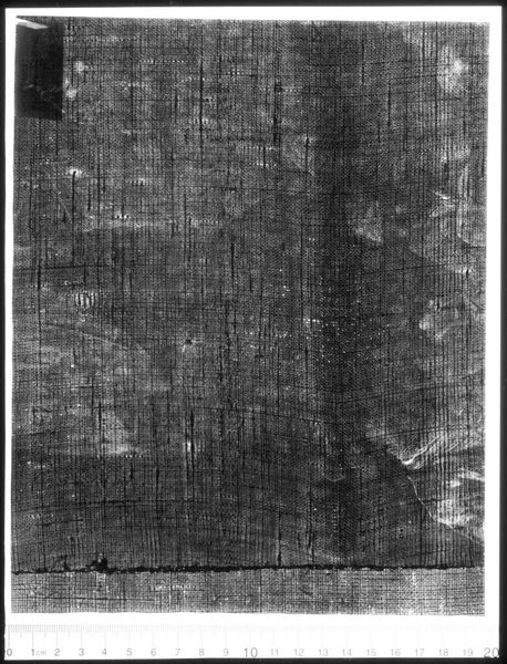 Curator: This is an X-radiograph of "Crucifixion with Three Saints on reverse", possibly by Lorenzo d'Alessandro da San Severino. Editor: Initially, it evokes a sense of hidden history, like looking beneath the surface of time itself to reveal an unseen foundation. Curator: Absolutely. This X-ray provides a critical lens, allowing us to explore the artist's process and the underlying structure of the work. What stories are embedded within this cultural object, and how does its construction tie into socio-historical contexts? Editor: I am most interested in the materials themselves, the layering, the density revealed by the X-ray, and how it speaks to the labor involved in its creation. Curator: It is a reminder of the power dynamics often embedded in art production, revealing both individual artistry and the social conditions in which it was conceived. Editor: Indeed, this process of analysis gives new meaning to art history, doesn't it? Curator: It does; I find these insights incredibly valuable.