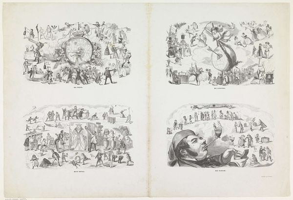 Editor: Here we have "January – New Year's Eve" by George Cruikshank, one of a series of steel etchings from the mid-19th century. It feels incredibly lively, almost chaotic, capturing a bustling party scene. What's your interpretation of this festive chaos? Curator: This print offers a glimpse into the social and cultural dynamics of 19th-century England. Cruikshank’s work, while seemingly celebratory, often critiques social mores. Look at the extravagance depicted – the overflowing scene of revelry. Can we see this New Year's Eve party, through our contemporary lens, as a microcosm of class disparity and perhaps even social anxieties around displays of wealth? Editor: That’s a really interesting point. I hadn't considered the potential for social commentary. I was focused on the joyful exuberance, but the excess is hard to ignore. Do you think the style of caricature emphasizes that critique? Curator: Absolutely. The exaggeration inherent in caricature, particularly Cruikshank's style, allows him to highlight the absurdities and excesses of the time. Think about the figures, their expressions, their postures; they border on grotesque. How might we read this through the lens of feminist theory, for instance, considering the representation and possible objectification of the female figures within this scene? Editor: So it's not just a party scene, but a complex statement about the social landscape. Seeing it through that lens makes the image much more powerful. Curator: Precisely! And it reminds us to always question whose story is being told and from what perspective. Considering gender, class, and social commentary transforms this from a simple depiction of revelry into a potent piece of social critique. Editor: This has really changed how I view this print; it is much deeper and complex than I initially thought. Thank you for illuminating all those dimensions. Curator: My pleasure. Hopefully this approach enriches your understanding of art and its connection to broader socio-political contexts.
