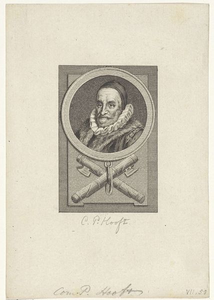 This is G. van Citters' portrait of a man with a kippah, long hair, and beard. It's rendered in monochrome, and its dimensions are approximately 198 by 130 millimeters. The subject is framed within an oval, which immediately imposes a sense of classical structure, reminiscent of Renaissance portraiture. The artist's technique employs fine, closely-knit lines to define form and texture, especially noticeable in the detailed rendering of the man's facial features and the drapery of his clothing. The etching technique is quite intriguing, since the lines create a play of light and shadow that models the form. The framing is quite unusual because it imposes order while also creating a sense of depth, inviting the viewer into a focused observation of the individual. The linear quality reinforces a kind of visual encoding, where the individual's identity is constructed through a network of etched signs. This is not just a picture of a man, but a structured presentation that invites us to decode its layers.