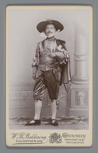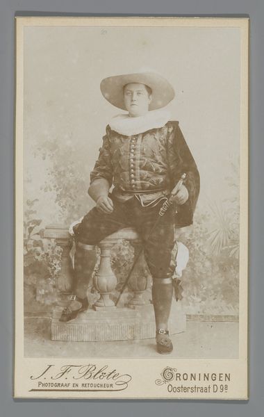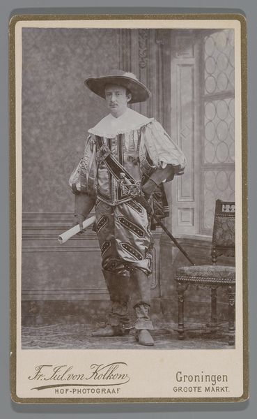 Curator: Friedrich Julius von Kolkow captured this fascinating image, "Portrait of an Unknown Groningen Student in Masquerade Costume," sometime between 1890 and 1900. It's part of the Rijksmuseum's collection. Editor: The high contrast gives the photograph an arresting theatrical feel; he's positioned with such confidence, the ruffled collar emphasizing his regal stature. Curator: Note the photographer’s information at the bottom. “Hof-Photograaf.” This indicates a Royal warrant from the Dutch court; Kolkow was obviously quite the entrepreneur! But focusing on the sitter: What drove the subject, this anonymous student, to meticulously stage himself this way? Editor: Perhaps a commentary on performativity or class distinction? He certainly appears self-aware. I wonder if that small table beside him functions as a sort of pedestal? The props indicate a story we can only attempt to unlock now, by reading into their formal composition and relation to each other. Curator: Exactly! And those costumes, though, tell a story of labor and materials. How long did it take to tailor his intricate Renaissance garb? Were these readily available or meticulously handmade, signaling a level of access and even economic display amongst the student circles in Groningen? Also, considering the costume and his pose, might this photo have been taken during some student association or university-related event? It would say so much about academic social life at the time. Editor: That’s true, the materiality here is more complex than meets the eye. It seems he also had a sense of historical theatre and costume. The monochrome palette adds to that sense of constructed performance, and the pictorialist style offers this historical moment to become an eternal theater play. The textures come alive, thanks to Von Kolkow's masterful treatment. Curator: Well, Friedrich Julius von Kolkow, with his keen awareness of photographic conventions, provides an entrancing portal to Groningen’s history! Editor: It makes one reconsider the potential for even a standard photo of this time to represent more than just an individual, but also the signs, visual markers and societal codes for the ages to come.