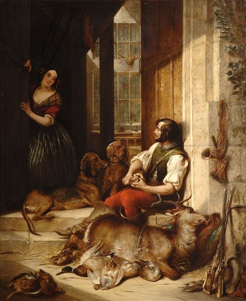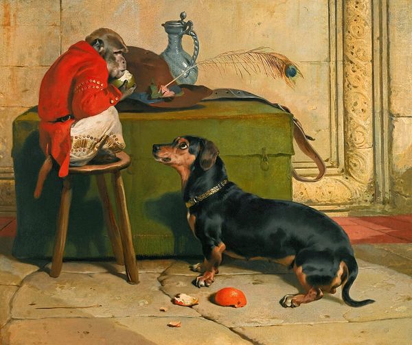 This painting, "Jack In Office" by Edwin Henry Landseer, presents a tableau of canine characters rendered with meticulous detail in oil on canvas. The painting is structured with a clear hierarchy, dominated by a stout, authoritative dog perched atop a workbench. Landseer employs a semiotic system where dogs stand in for human roles, challenging fixed notions of species and class. The composition is carefully arranged, with the 'Jack in Office' elevated both literally and figuratively, overseeing his subordinates. The textural contrasts between the smooth fur of the dominant dog and the rough stone of the setting destabilize the conventional distinction between nature and culture. The use of warm colors, particularly in the foreground, draws the viewer's eye, while the darker tones in the background add depth and a sense of enclosure. The painting's formal qualities, from its hierarchical composition to its detailed rendering of textures, serve to emphasize the instability of social categories. It invites us to consider the ways in which power and status are visually constructed and contested.