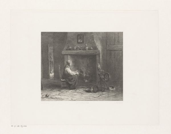 Editor: This is Felicien Rops’ "Vrouw aan een spinnewiel" or "Woman at a spinning wheel," created in 1876. It’s an etching, isn’t it? It feels very… contained, domestic. What do you see in this piece, beyond the obvious genre scene? Curator: The obvious can be deceiving! Look at the date: 1876. What was happening then for women, especially working-class women? Think about industrialization. Editor: Okay, so industrialization is drawing people away from these traditional crafts... Curator: Exactly. This image, seemingly innocuous, becomes charged. Rops, often associated with more…provocative subject matter, here seems to offer a comment on the disappearing role of women in production. She's almost fading into the background, swallowed by the shadows. Notice the angle of her head. Does she make eye contact with us? Editor: No, she doesn't. It is as if she is disappearing into her labor. It seems the domestic space which had always been female owned, is changing for the times. Curator: And who benefits from this change? Consider the male-dominated factories rising at the time. The work available was very often gendered, and very often in favor of males. Her lack of presence challenges the patriarchal narratives developing, by showcasing her dwindling industry. What do you think about the darkness? Is there a symbolic meaning there? Editor: Well, the spinning wheel itself evokes stories like Sleeping Beauty, but here the fairy tale feels much darker. There's a melancholy, a sense of loss in the darkness that the wheel casts, hinting at something bigger, a social commentary maybe? Curator: Precisely! It encourages us to question whose stories are told, and whose are erased in the march of “progress." Thank you, I think this artwork is best seen within these complex, societal frameworks that provide more social and cultural nuance. Editor: This piece definitely has more to say than meets the eye. Considering social changes really does reframe how we view what appears, at first, like a standard scene!