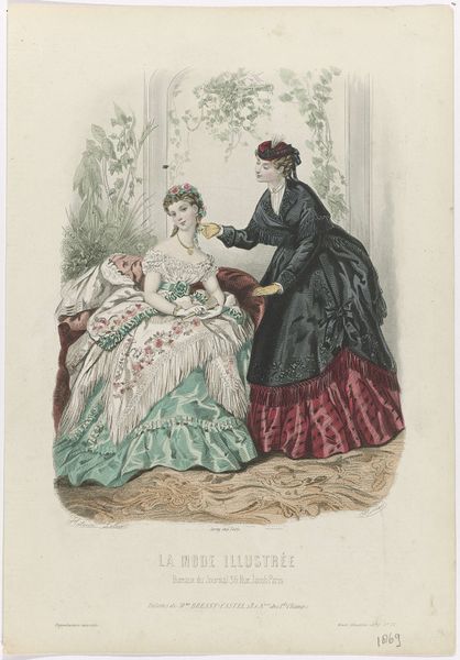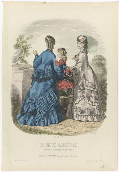 Editor: So, this print is titled "La Mode Illustrée, 1871, No. 21" by J. Bonnard. It seems to be a lithograph. What really strikes me are the intricate dresses; you can almost feel the layers of fabric. What do you see in this piece? Curator: Well, considering the print's materiality – lithography – we can think about how this reproductive technology democratized fashion. It allowed for wider circulation of trends, influencing production and consumption of textiles and clothing. What were these dresses actually made of? Who were the laborers involved in creating these garments and this very image? Editor: That's fascinating! I hadn’t considered the industrial aspect. It’s easy to just see them as pretty dresses. Curator: Exactly. But focusing on materiality shifts the emphasis. Look closely – are those mass-produced fabrics, or bespoke designs? Also, how does the lithographic process, with its inherent limitations and reproducible qualities, affect the value and perception of fashion? Editor: I guess it makes high fashion more accessible as an ideal, even if the actual clothes remained out of reach for most. So, this image becomes part of the cycle of desire and consumption. Curator: Precisely. And how does that impact social hierarchies and the very definition of "high art" versus "craft?" Editor: Wow, that completely reframes how I see fashion plates. It’s not just about the surface anymore; it's about the whole system. Curator: Indeed. Examining the material conditions behind even the seemingly frivolous reveals complex social and economic relationships.