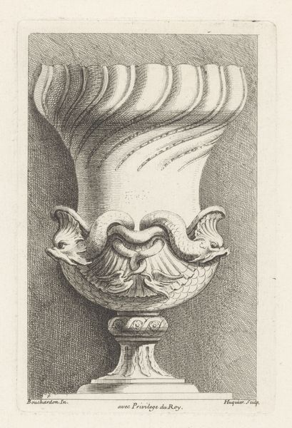 This print of a vase with mermen was made by Gabriel Huquier, sometime in the 18th century, using etching and engraving. Consider the labor involved in creating such a detailed image. Each line was manually incised into a metal plate, a testament to the engraver’s skill. The printmaking process, while allowing for reproduction, still required meticulous handwork. The vase is adorned with mermen, mythical creatures that lend a touch of the fantastical, reflecting the Baroque and Rococo periods’ love for ornate and elaborate designs. However, this wasn't just about aesthetics; it was also about commerce. Note "avec Privilege du Roy," a mark of royal endorsement, allowing Huquier to produce and sell his prints under the protection of the monarchy, indicating the intersection of art, power, and economic privilege. By examining the printmaking process, and the systems of labor and patronage that surrounded it, we gain a deeper understanding of its cultural value.