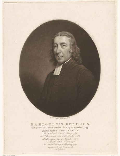 Editor: Here we have Charles Howard Hodges’ 1796 engraving, "Portrait of the poet and preacher Matthias Jorissen," at the Rijksmuseum. It has a kind of stoic calmness to it. What can you tell me about the socio-political context of an engraving like this? Curator: Well, consider the late 18th century. The Neoclassical style, exemplified here in its restraint and focus on the individual, arose during a period of significant upheaval. What role did images play in shaping public opinion and solidifying authority during revolutionary times? Editor: I guess portraits of influential figures like Jorissen could help establish their presence in the public sphere? Curator: Exactly. Engravings were also relatively reproducible compared to painted portraits. This increased circulation would broaden the figure's recognition, as well as the messages or values associated with him. Given that Jorissen was both a preacher and a poet, how might the visual language of this engraving reinforce those roles? Think about clothing or gaze, or the way in which the picture is cropped by a faux frame... Editor: It seems meant to project him as respectable and thoughtful, with that slightly sidelong look, doesn’t it? But wouldn't wider circulation mean there’s also a loss of control over interpretation? Curator: Precisely. Once an image enters the public sphere, its meaning becomes fluid and open to interpretation, which creates an avenue for potential debate and challenges to the established order. It's a delicate balance of power and representation. This engraving offers a small view into understanding the mechanics and cultural politics surrounding representation in late 18th century Europe. Editor: That's given me a lot to think about—how visual culture both reflected and shaped public perceptions of authority. Curator: Indeed. It prompts us to examine art not as isolated objects, but as active participants in broader social and political conversations.