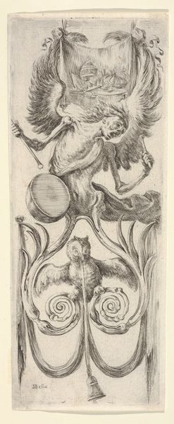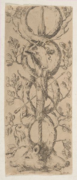 Editor: Here we have Stefano della Bella's "A hunting trophy, two wild boar heads above, two deer heads below" made sometime between 1650 and 1656. It's a print, a drawing. I find the composition really striking, with those animal heads so deliberately arranged. What do you see in this piece, considering its context? Curator: This print, part of della Bella's "Ornaments or Grotesques" series, speaks volumes about power, privilege, and the fraught relationship between humans and nature in the 17th century. It's not just a decorative piece; it's a statement of dominance, wouldn't you agree? Editor: Dominance? I hadn’t really thought about it that way. It just seemed like...taxidermy almost? Curator: Think about it – these aren’t just animals; they are trophies, symbols of successful hunts, displayed to project authority and social standing. This imagery reinforces a hierarchy where nature is subservient to the whims and desires of the powerful. Where does the power really lie? Editor: I see what you mean. So, the artist is not necessarily celebrating nature, but reflecting the social values of the time? What would be some current parallels to hunting? Curator: Exactly! Della Bella offers a glimpse into the socio-political landscape, hinting at the unequal distribution of resources and the justification of power through exploiting the natural world. How does it reflect consumerism or capitalist exploitation today, then? What is being hunted, consumed, and displayed now to shore up privilege and position? Editor: Hmmm...that's really fascinating, food? Fashion? It is interesting to reflect on how some things never change. Thanks for making me look beyond the surface. Curator: My pleasure, understanding art is also to comprehend history in progress, helping us decode these symbolic languages can challenge dominant narratives and inspire critical reflection.