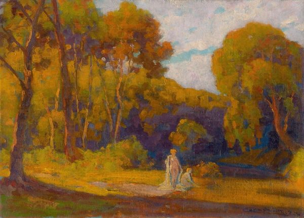 Robert Lewis Reid painted "Breezy Day" with oil on canvas, capturing a serene outdoor scene where the interplay of light and shadow creates a palpable sense of atmosphere. The composition is structured around broad, impressionistic brushstrokes. Notice how Reid uses contrasting shades of blues and greens to define the trees, foliage and meadow, while softer tones illuminate the figures of the women. The texture of the paint itself becomes a crucial element, evoking the density of the leaves and the fluidity of the air. Reid masterfully employs the formal properties of color and light to evoke a sense of transience and ephemerality. The painting doesn't just represent a landscape; it embodies a moment, a fleeting encounter with nature’s subtle beauty. It invites us to consider how art can capture not just what we see, but how we feel.