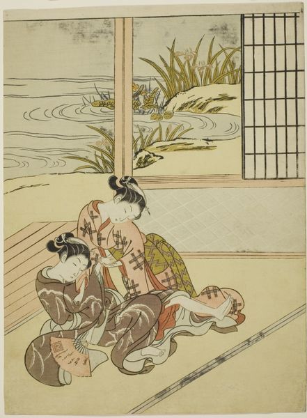 This is "The Music Lesson," a woodblock print by Suzuki Harunobu, created sometime in the 1760s. Harunobu was a leading artist in Edo-period Japan, a time of economic growth and cultural flourishing, but also rigid social hierarchies. Harunobu is renowned for his depictions of daily life, especially those featuring women. Here, a young girl is receiving instruction on the shamisen. The image provides a glimpse into the world of women and girls, whose lives were often confined to domestic spaces. The presence of the shamisen, along with the elegant setting, indicates a level of cultural refinement and leisure. It also reinforces traditional gender roles of the time, where music was often seen as a desirable accomplishment for women. This print also reflects the growing popularity of *ukiyo-e*, or "pictures of the floating world," which celebrated the ephemeral pleasures of urban life. But by depicting the interiority of women's lives, Harunobu also subtly challenged the male gaze that often dominated traditional art forms. It's an intimate moment, rendered with sensitivity and grace.
