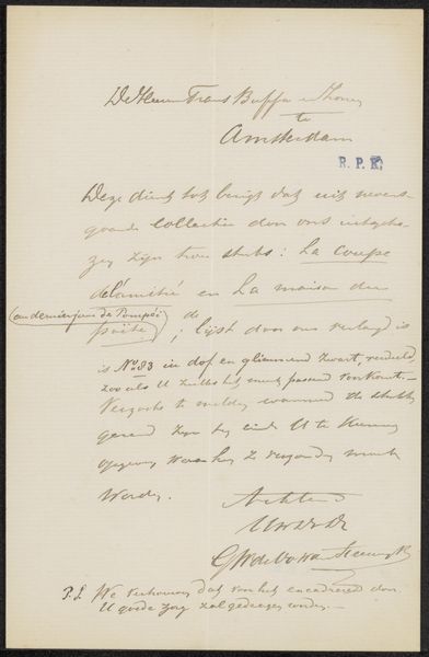 This is a letter written in 1884 by Carel Nicolaas Storm van 's-Gravesande to Philip Zilcken, offering thanks for an article in 'de Kunstbode', a Dutch art magazine. This exchange occurs within a 19th-century art world increasingly defined by the written word. As artists began to write about art, criticism became a vital element in shaping artistic reputations and movements. Gravesande, who was both an artist and a writer, situates himself within this emerging cultural landscape. His letter, beyond a simple thank you note, highlights the growing importance of art criticism and journalism, which became essential for artists seeking recognition and engagement with broader audiences. The personal, handwritten nature of the letter offers an intimate look into artistic relationships and the development of an art world increasingly mediated through the written word. It's a reminder that while art history often focuses on the visual, the conversations, debates, and personal connections within the artistic community were also critical to its development.