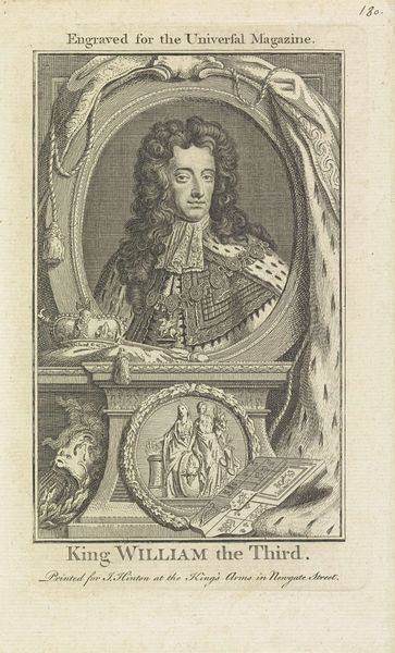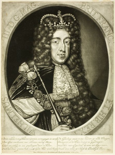 Jacob Gole created this portrait of Willem III, Prince of Orange, using etching techniques. The composition is structured around a hierarchy of textures and forms. Notice the contrast between the soft, flowing curls of Willem's wig and the rigid, geometric lines of the table at the bottom. The interplay between light and shadow articulates the textures of the velvet robe, lace cuffs, and feathered hat, drawing our eye across the artwork. This emphasis on surface detail invites a semiotic reading, where clothing and adornments function as signs of status and power. The strategic placement of each object—the scepter, the drapery, and the ornate decorations—reflects not just a likeness of the sitter but also engages with broader cultural codes around monarchy and representation. The portrait is a study in the art of visual rhetoric.