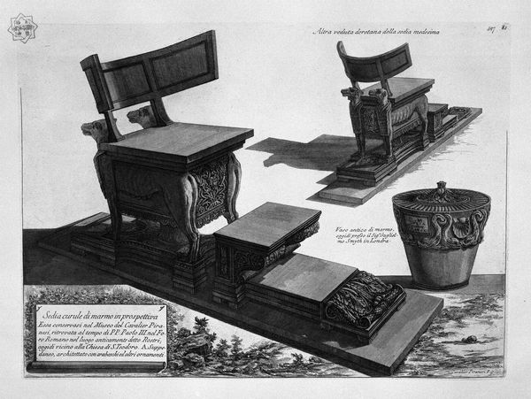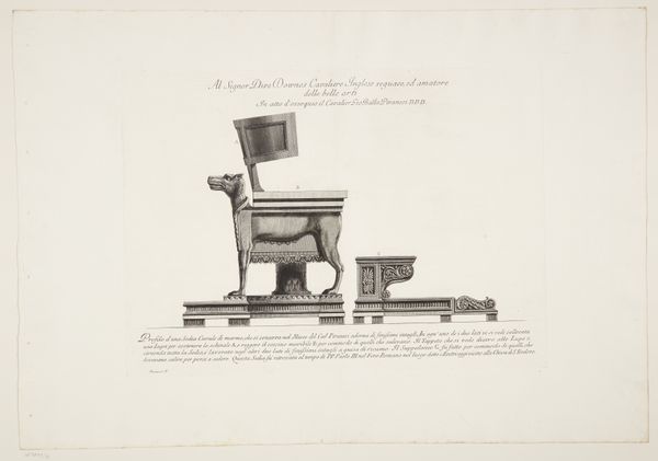 Curator: This etching by Giovanni Battista Piranesi depicts what's described as the profile of a "Curule Sedia" from the Piranesi museum. I'm struck by its imposing and peculiar form; it looks like a throne for a Roman deity who had an affinity for canines. Editor: Yes, that's an intriguing observation! At first glance, the hybridity is striking - the regal seat conjoined with that canine form seems incredibly strange. Given the nature of Piranesi's other engravings, I’m also stuck by a curious tension: a tension between fidelity to antiquity and individual imagination. Curator: Absolutely. The Lupas flanking the sides suggest the she-wolf of Rome and that nod to classical symbols is evident. We know Piranesi heavily studied Roman antiquity and often incorporated familiar Roman architectural components and features into his work, but the choice to integrate them with such strange zoomorphic, hybrid forms—well, that's open for interpretation. Editor: And doesn't the print subtly challenge traditional historical representation? The etching, although appearing factual and almost mechanical with its labels “A”, “B”, “C”, could very well be based on speculation more than faithful rendering. I'd argue that he's prompting the viewer to reconsider the role of monuments, too. By combining realistic, architecturally precise elements with pure fantasy, he makes us question the line between objective fact and subjective interpretation. Curator: I see what you mean. There's this implied skepticism that becomes characteristic of later historical thought. Perhaps by presenting this kind of fantastical recreation as an objective, verifiable document, Piranesi encourages critical engagement rather than blind acceptance of established narratives. It could also symbolize the cultural memory we attach to ancient power, filtered through shifting perceptions. Editor: In any case, "Profile of Wheelchair"—or should we say "Profile of the Curule Sedia?"—proves that there's no such thing as a simple act of historical reproduction!