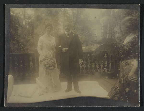 Editor: So, this photograph, a gelatin-silver print, captures the wedding of Pat Furnée and Elisabeth Kalff. It was taken sometime in the 1950s by Hans Nieuwenhuis Sr. There's something really sweet and staged about the image, and even a little bit humorous with the groom's formal top hat and the flower girls. What’s your take? Curator: It whisks me back! Remember those family albums, the kind you'd gingerly leaf through at your grandparents' house? It's more than just a portrait; it’s a scene lifted from life, genre painting captured on film. A stage-managed memory, like a dream, really. Don't you think there's an echo of Dutch Masters, the attention to light, the formal composition? Editor: That's interesting. I hadn't really considered it in relation to Dutch painting. It felt more like a personal memento. Curator: Exactly, that's the delicious paradox! The personal *is* political and cultural. The formality suggests something about postwar society – a desire for order and tradition perhaps? What’s striking for me is the weight placed on social ritual. It feels…almost theatrical, like life as performance. Does that resonate with you? Editor: Absolutely, now that you mention it. I guess that theatrical quality contributes to that underlying sense of humour that I picked up on initially. Curator: I think that humour comes precisely from the tension between the everyday reality and the high-minded ideals of the wedding day. Editor: That's a perspective I hadn't considered before. Thanks, I learned a lot about thinking about the photo not just as a photograph, but as a cultural object! Curator: My pleasure, every picture has something to whisper if you're willing to listen. I think I'll now see family pictures differently!