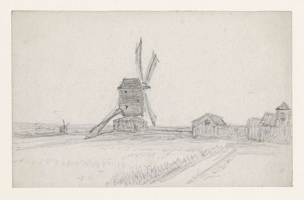 Curator: Welcome. Before us, we have Jozef Israëls' "Landscape with Mill and Figure with Umbrella," likely executed sometime between 1834 and 1911, crafted with pencil on paper. Editor: There’s something stark and honest about the use of just pencil. It creates an immediacy, almost like catching a fleeting memory of a blustery day. You can almost feel the wind in the umbrella’s fabric, and hear the creak of the mill. Curator: The windmill itself stands as a profound emblem within Dutch consciousness—a symbol of triumph over water, the industrious spirit shaping the landscape itself, and perhaps, subtly, even national identity. It speaks of generations, continuity... Editor: I agree, and notice how the focus isn't necessarily the grand engineering or technological accomplishment, but rather, its humble interaction with the everyday – the solitary figure with the umbrella, perhaps sheltering from the rain. We’re seeing how ordinary life is shaped by its resources. The way Israëls uses varying pencil pressure hints at both structure and atmosphere. The paper, acting almost as a kind of neutral ground for their confluence. Curator: Absolutely. Consider the umbrella itself. It’s more than protection; it becomes a shield, an assertion of individuality against the backdrop of the elemental forces surrounding them. The tilted axis suggests struggle. Editor: Exactly. Its crude almost hurried rendering, is intriguing. The artist really captures that feeling of needing protection from something that may be relentless. This kind of artwork reminds us that the seemingly ‘high’ idea of art also requires a relationship with raw material. It is through a sustained work relationship with matter that things take on such weight, you see! Curator: Indeed, the visual economy deployed here creates resonance. From this bare-bones rendition, we receive layer upon layer of cultural and human significance. Editor: Ultimately, the simplicity is deceiving. Its that attention to material, both subject matter and support, that is compelling. Curator: Well said, reminding us how closely the symbolic and material intersect. A great moment to reflect!