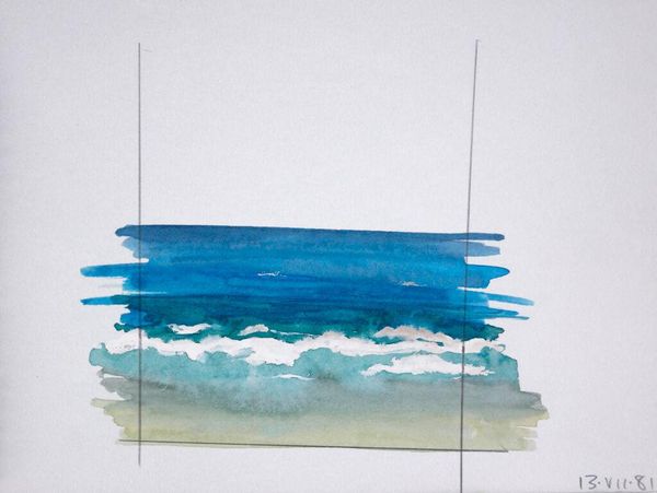 Editor: So, this is Elena Prentice's "Seascape," a watercolor piece. It's quite small, but the strokes of color are so evocative. What's striking is the raw simplicity of the materials. What can we read into Prentice's process here? Curator: It’s interesting to consider the materiality. Look at how the watercolor almost resists being contained, bleeding into the paper. It points to the artist's direct engagement with the medium and to the commodification of landscapes. How does this reflect the labor required to produce this image? Editor: I never thought about it that way; I was caught up in the aesthetic of it. Curator: Exactly! It challenges the romanticized view of nature, emphasizing the artist's labor and the very real resources used to create this vision. Editor: This has completely reshaped my understanding of it. Thanks! Curator: Likewise; I'll be looking at watercolors differently from now on.