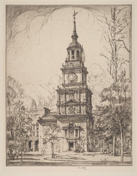 Editor: This is Rudolph Ruzicka’s "St. John’s Chapel, New York." It's a lovely rendering in black and white. The church looks grand, almost like a classical temple. What symbols or meanings do you see embedded within it? Curator: The steeple acts as a visual metaphor, doesn’t it? Pointing to the heavens, it’s an enduring symbol of aspiration, of reaching beyond our earthly concerns. Notice how Ruzicka contrasts this with the solid, earthbound buildings around it. What does that contrast evoke for you? Editor: It makes the church seem separate, a beacon amidst the everyday world. Curator: Precisely! And the classical architecture—the columns, the pediment—evokes ideas of order, reason, and the enduring strength of tradition. Ruzicka seems to be asking us to consider what remains constant in a rapidly changing urban landscape. Editor: I hadn’t thought about it that way. It’s more than just a picture of a building; it's about what that building represents.