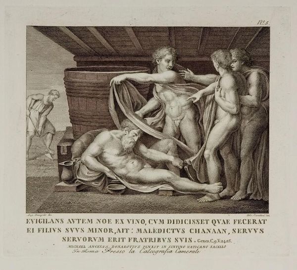 Editor: This is Domenico Cunego’s "Creation of Woman". It's hard to put a date on it, but Cunego lived in the 18th century. The scene feels very posed and dramatic. What historical context informs Cunego’s artistic choices here? Curator: Well, consider the engraving medium itself – it allows for incredibly precise linework, almost like drawing with light. This particular print is after Michelangelo’s Sistine Chapel fresco. Doesn't the echo of Michelangelo, filtered through Cunego's hand, give it an added layer of meaning? It's a conversation across centuries! Editor: That’s a great point. So, it's not just the subject matter, but the way it's been reinterpreted. Curator: Exactly! It makes you wonder what Cunego wanted to say by revisiting such an iconic image, doesn't it? Editor: Absolutely, I will keep that in mind.