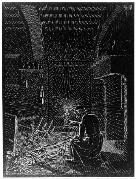 In 1947, the Dutch artist M.C. Escher created this New Year's greeting card for the Nederlandse Exlibris Kring, a Dutch society for collectors of bookplates. Escher's image speaks to the mood of a Europe emerging from the darkness of the Second World War. The print depicts a pair of hands climbing a ladder out of a well. In the local context of the Netherlands, still recovering from German occupation, the image and its caption "Wij Komen Er Uit!"—meaning "We are getting out of it!"—would have resonated deeply. Escher was a member of the Nederlandse Exlibris Kring, which commissioned the print, reflecting his social standing within the Dutch artistic community. A historian, using sources like membership records and period publications, can explore the role of such societies in fostering artistic expression and solidarity during times of social upheaval. In this context, art reflects and shapes the collective experience of a nation rebuilding itself.