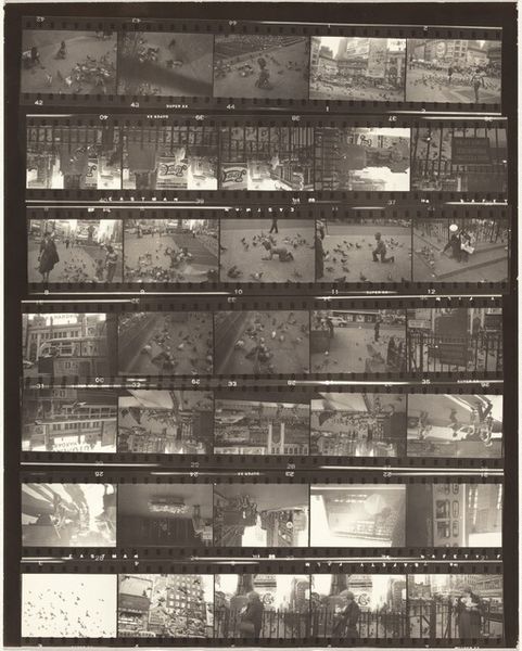 Editor: Here we have Robert Frank's "From the bus 70," a gelatin silver print dating back to 1958. Looking at this contact sheet, a series of street scenes captured in a monochromatic palette, I'm struck by a sense of fleeting moments, a visual diary of urban life. What narratives do you think Frank was trying to capture or convey with this work? Curator: That's a perceptive observation! Frank was indeed interested in capturing fleeting moments, but not just any moments. He sought out those interstitial spaces where the undercurrents of American society bubbled to the surface. "From the bus 70", like much of his work from *The Americans*, disrupts the carefully constructed image of post-war prosperity. The sequencing in a contact sheet like this emphasizes themes of alienation and the subtle segregation woven into the fabric of American life. Editor: Segregation? I see scenes of everyday life. Are you suggesting he was intentionally highlighting inequalities? Curator: Absolutely. While seemingly capturing daily life, Frank was drawn to what lay beneath: racial tension, economic disparities, and a sense of disillusionment. Even the grainy, high-contrast aesthetic was a deliberate choice, rejecting the slick, commercial photography of the time. He sought authenticity. Can you see how the fragmented composition of the contact sheet mimics the disjointed experience of those marginalized within society? Editor: That's a powerful interpretation. I hadn't considered how the format itself could contribute to that sense of fragmentation and social commentary. Seeing it this way really adds a layer of meaning I hadn’t noticed before. Curator: Indeed. Art is never neutral; it's always in conversation with the world around it. By examining the socio-political landscape in which "From the bus 70" was created, we can begin to understand its lasting impact on photographic representation. Editor: This has been incredibly enlightening; thank you for sharing your perspective! It’s fascinating how historical context can reshape our understanding of even a seemingly simple snapshot. Curator: The beauty of art lies in its ability to spark these conversations and challenge our assumptions. There is always more to see and consider.
