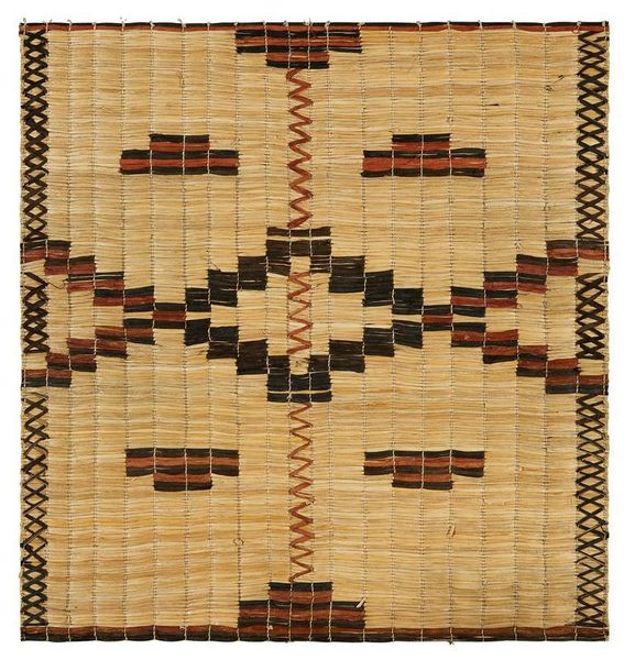 Editor: This is a "Figured mat with zigzag pattern" from the late 19th to early 20th century. It is fiber art, a textile also referred to as "chitarape." I am drawn to the geometric organization here, that really emphasizes material properties, what do you see? Curator: The construction is remarkably unified; observe how the zigzag motif acts as a counterpoint to the horizontality of the woven fibers. Note also the limited palette: earth tones accented with stark, rhythmic lines in black. It yields a visually arresting study of contrasts. The composition adheres to a strict geometric order. Editor: How important is it to understand what the zigzag represents? Is that a culturally specific symbolic form? Curator: While contextual knowledge is beneficial, the work invites consideration of its own formal qualities. The beauty resides in the arrangement itself. Observe, for example, the tension between the natural irregularity of the fiber and the perfect geometry of the lines. Do you discern this dialogue between nature and artifice? Editor: I think I do, particularly in the inconsistent spacing between the stitched pattern near the edges. So even without understanding exactly where and when this was made, we can appreciate how the piece uses formal elements to create balance, tension, and visual interest. Curator: Precisely! We are responding to the artist's engagement with materiality and form. And such engagement transcends temporal and geographical boundaries. The piece operates as a testament to the universal power of abstraction. Editor: Right. Focusing on the piece's internal relationships between material and structure illuminates the mat beyond any one reading. Curator: Agreed, an analysis of its forms speaks for itself.