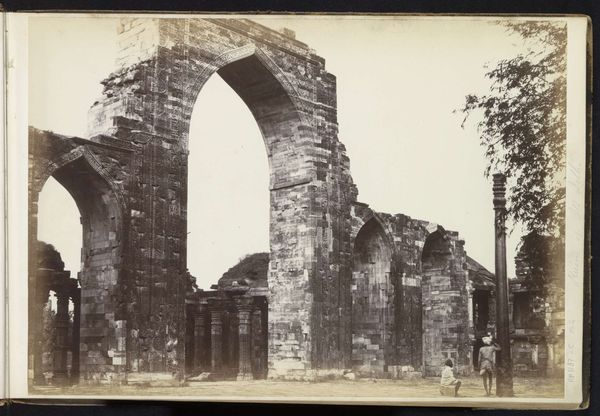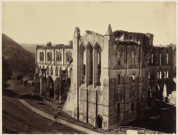 Editor: Here we have Alfred Capel Cure’s “Wenlock Abbey,” taken in 1858. It's a gelatin-silver and albumen print photograph, and what strikes me most is the starkness of the ruins. They’re so clearly defined, almost… clinical. What do you see in this piece? Curator: I’m immediately drawn to the photographic process itself. Consider the labor involved: the preparation of the light-sensitive emulsions, the exposure time, the darkroom work. Photography in 1858 wasn't instant; it was a craft, a manufacturing process that involved considerable material knowledge and physical work. And how does that physical process affect our viewing of what is considered ‘fine art’ today? Editor: That’s fascinating! So, you're saying that the medium itself – the physical making of the photograph – is key to understanding the artwork? How does the architecture, and the use of ruins here, affect this concept? Curator: Precisely! We're not just seeing a landscape. We're witnessing a specific moment in photographic history. The ruins act as both subject matter and evidence of material change over time. What are these building ruins composed of? By who, and for what, were these ruins once crafted? Then they are pictured by Cure. What labor, and time, did it take for him to present this artwork of the ruins? Ruins also are objects, and by questioning its origin, we question its process and function of materials used to craft. It prompts questions about production and value. Is it documentation or art? How do we make that differentiation today, with so many easily-captured photos taken every single day? Editor: I never thought about it that way. The material process and the ruins' physical history really add another layer to the meaning. It's less about romanticizing the past and more about the concrete act of creation and destruction. Curator: Exactly. And perhaps that's the most enduring message of “Wenlock Abbey”: the interplay between labor, decay, and the ever-evolving definitions of art and artifact. It helps viewers reconsider preconceived values related to high art today. Editor: That really changes my perspective. Thanks, I’ve learned a lot! Curator: Likewise! Thinking about the material conditions always deepens the experience.