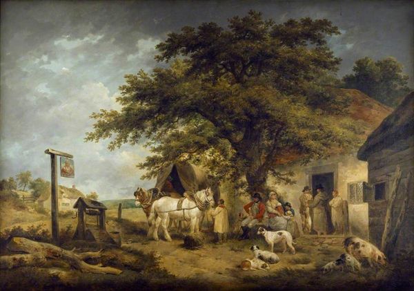 Editor: "The Cherry Seller" painted by William Collins in 1824 using oil on canvas… I'm immediately struck by how this scene feels like a fleeting moment captured in time. The light seems to dance across the figures. How do you find yourself interpreting this work? Curator: Ah, a fellow soul touched by fleeting moments! I see a symphony of rustic life – a nostalgic glance at simpler times. The figures aren’t mere representations; they're almost…characters in a play. Do you see the careful placement of light and shadow? It's like the artist is gently guiding our gaze. Editor: I do! There's a very strong diagonal composition to how the light is positioned and it really feels like Collins' is attempting to bring attention to that main character by focusing that central bright highlight right onto his back. Curator: Exactly! The backlighting accentuates his presence without overwhelming the scene. And what about the surrounding landscape, that lush romantic scene surrounding the figures; does that detail offer any deeper emotional reflection, I wonder? Editor: The landscape definitely contributes to the feeling of romanticized rural life. I almost wonder if this image romanticizes poverty for views? Is there any hint of this artist's social commentary here? Curator: That's a wonderfully insightful question! Collins’ work certainly dances on the edge of idealization, something many of his contemporaries grappled with. Perhaps he's inviting us not just to observe, but to reflect on our own relationship to the land, to community, and maybe even the burgeoning industrial world he lived in. Editor: I guess that kind of ambiguity is what makes art so compelling – it's never just one thing, is it? I feel like I look at this now with entirely different eyes. Thanks for shedding light on it. Curator: The pleasure was all mine! Never forget to allow a work to talk back to you and inform your experiences. Keep seeking those fleeting moments of revelation!