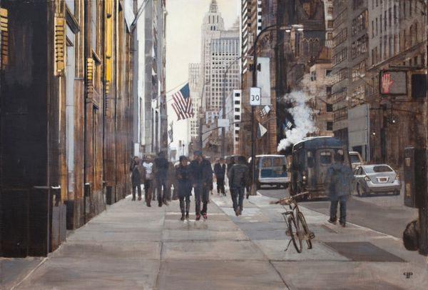 Curator: It's a somber feeling that hits me right away. A damp urban day rendered in greys, punctuated by the geometries of the crosswalk. Editor: Indeed. We’re looking at Patrick Pietropoli’s 2013 painting, "100, Park Avenue," an oil-on-canvas cityscape now held in a private collection. The artist captures a mundane urban scene with incredible attention to detail, but with an emotional resonance. Curator: Mundane, but not unremarkable. Think of cityscapes and all their symbolic weight. Buildings representing stability, human aspiration and our drive for progress and of course figures rushing by at ground level on their commutes. In many ways this image is the personification of forward momentum. Editor: Right. It feels emblematic of the daily rhythms and movements within New York's concrete canyons, speaking to a certain frenetic energy and routine of modern life. I can almost feel the weight of history pressing down. I think of Grand Central Terminal. The Beaux-Arts architecture feels symbolic of past aspirations and progress and is set in contrast with the much taller, unadorned modernist scraper looming in the background Curator: Yes! Grand Central acts as both architectural anchor and psychological reference. That kind of tension keeps it intriguing and rooted to the site-specific. These layers reflect not only history but also how culture shifts around static, enduring landmarks. Consider too that despite these impressive markers, we are closer to seeing only street life: the city is viewed primarily at human level. Editor: It's true; we view the architecture as pedestrians moving through the street, which changes everything about how the work gets interpreted.. Also, it seems that painting in muted colors, using this specific realism, lends the entire painting an air of introspection that makes it somehow universal as well as distinctly American Curator: I agree, and the almost monochromatic scheme pushes one toward considering symbols rather than surface-level engagement. It is asking what histories do these individuals carry as they cross that very specific road in real time, and who or what came before. Editor: In a city constantly rebuilding and reinventing itself, Pietropoli captures a transient moment anchored by a fixed monument. Curator: Very much. He distills so much of New York, capturing those unseen histories alive in its buildings and pedestrians. Editor: Exactly. An evocative slice of city life that reminds us how history and culture are intertwined in the everyday.