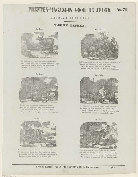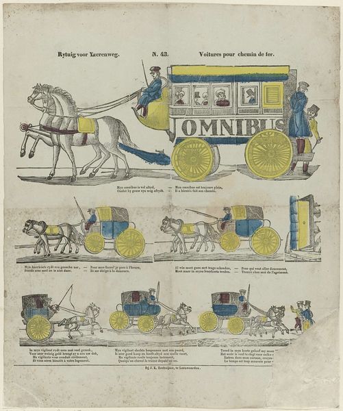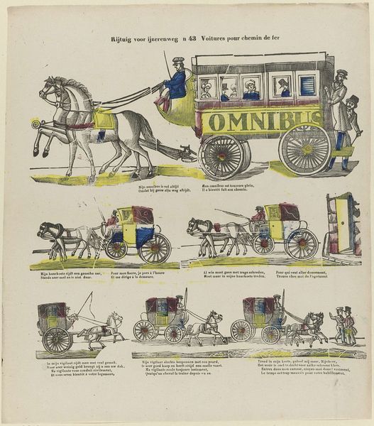 Curator: Allow me to introduce this detailed print, created sometime between 1856 and 1900 by Glenisson & Zonen. It's titled "Rijtuig voor ijzerenweg / Voitures pour chemin de fer"—Carriages for the Railway. Editor: Oh, my, it looks like a page ripped from a bizarre catalogue! All those earnest little horse-drawn contraptions, each striving to be fancier than the last. There’s such an air of hopeful aspiration… doomed, of course, by the oncoming train. Curator: Precisely. This piece showcases different types of carriages prevalent during the rise of railway transportation. What fascinates me is the implicit narrative about class and mobility during the industrial era. Editor: Class anxiety, indeed. Look at the cramped "omnibus" up top—clearly mass transit. But then, further down, the carriages get swankier, smaller, more private. Like status distilled into polished wood and spoked wheels. Are those tiny rhymes supposed to be advertisements? Curator: Likely so, it demonstrates an attempt to promote these horse-drawn vehicles even as the railways began to dominate transportation. It speaks to the tensions of technological progress and established social hierarchies. These would have likely been advertisements to sell the carriages at a higher price based on individual needs. Editor: I see that now, though they're also just tragic in a sweet sort of way. Like a carriage builder screaming into the wind and no one hears him over the sound of an oncoming train. This must have been around the time horsedrawn vehicles transitioned into being just pleasure-rides! Curator: A valid point! The transition reflects not only a shift in transport, but in the meaning ascribed to it. What once represented progress and commerce slowly transformed into symbols of leisure and, yes, even a certain quaint nostalgia. Editor: Well, I definitely feel that quaint nostalgia looking at this piece. So wonderfully overwrought. One might as well appreciate all this finery, right? Curator: Agreed. It provides such a revealing glimpse into a society grappling with dramatic technological and social change.