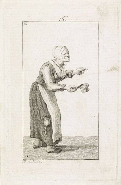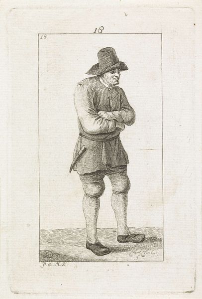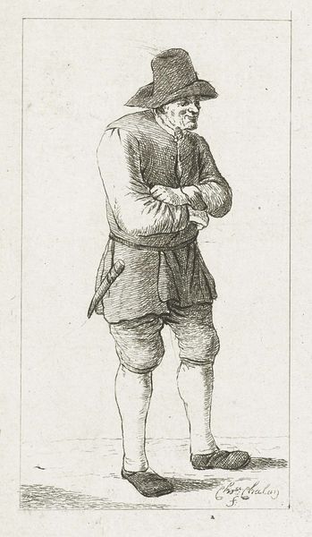 Curator: Let's examine Pieter de Mare's "Standing Man with Pipe and Jug," dating back to 1777-1779, here at the Rijksmuseum. The engraving captures a single figure in what I'd say is genre-painting style. What are your immediate thoughts on encountering it? Editor: It's remarkably tactile for an engraving. I can practically feel the roughness of the man's clothes and the cool, glazed surface of that jug he's holding. You immediately notice the textures due to the engraving technique. Curator: Indeed. Consider how tobacco, depicted here with the pipe and jug, came to represent leisure and contemplation but also ideas related to trade routes and colonialism at the time. What kind of memory gets stirred for you when viewing these icons? Editor: Well, that jug, particularly its manufacture and everyday use, highlights the intersections of art, craft, and the burgeoning consumer culture. The engraving process itself, meticulously reproduced, made such imagery more accessible, feeding that consumption, so in that respect the meaning might extend out of representation into the mechanics of its time. Curator: Good point. Beyond the commercial implications, one wonders about the depicted individual, too. There's a vulnerability in his gaze and posture, hinting at something deeper than just enjoying leisure time. Do you see a symbolism or cultural significance present that points past his contemporary era? Editor: Perhaps, although the very ordinariness of the subject is, in a way, remarkable. It invites one to think about the lives of ordinary workers, how materials and skills, like pipe-making, played such a vital part. The value lies in it showing that labor, materials, and commerce touch even the individual, isolated as this fellow appears to be. Curator: Ultimately, Pieter de Mare presents us with more than a snapshot of a man enjoying his pipe. He's offering a glimpse into the interconnected webs of culture, commerce, and individual identity. Editor: A reminder that even seemingly simple images conceal layers of social context and material realities waiting to be uncovered, particularly because engravings allow an expansion and distribution unavailable at a craft level, or with original portraiture.