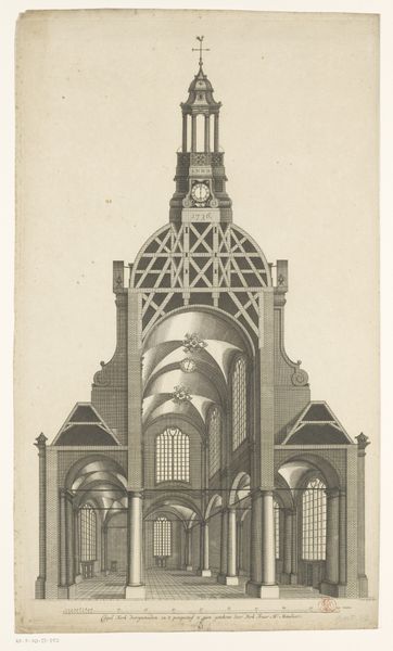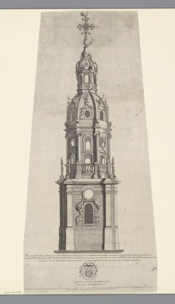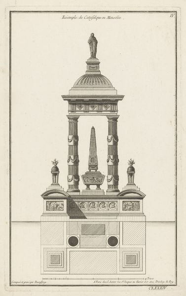 Curator: Here we have "Katafalk met obelisken," an architectural drawing, or more precisely, an engraving by Jean François de Neufforge, dating back to somewhere between 1772 and 1780. It is currently held at the Rijksmuseum. Editor: Oh, my. Isn't it magnificent? It seems strangely calming. Like a quiet giant patiently waiting, dreaming. And the swirling obelisk rising, like thoughts climbing upwards. Curator: Yes, there's definitely a stillness. What you're picking up is perhaps a symptom of the Neoclassical movement—this deliberate return to classical forms, an almost archeological excavation of a monumental style. But also, what do you think about the social and political environment informing Neufforge’s work? Editor: Hmm. On one level, Neoclassicism projects an imperial kind of power—the state rendered through buildings and monuments. However, these projects also show this hunger for finding perfect forms and shapes, with perfect clarity. Maybe an illusionary escape. And I sense that hunger, right, as the obelisk reaches higher and higher. Curator: Precisely, these imagined structures reveal complex historical narratives. We can consider, on one hand, this aspirational imperialist power through architecture as connected to gendered and class-based norms that further the entrenchment of monarchy in European aristocracy. This sort of architectural fantasy is of course totally exclusive to its context. Editor: Sure. Exclusivity, I suppose it is about access. And this architectural drawing—or architectural possibility—would then almost literally restrict that access. Like, come gaze but never enter. Still I love how this engraving plays with line. How that shaded bit there almost hints at secrets... things buried or hidden... Curator: What’s intriguing is how he manipulates those formal conventions. What appear to be very organized linear, structured forms quickly shift into landscapes or garden environments. We should not ignore its possible escapist quality. Editor: I love the interplay here, now you have me really looking. Escapist indeed. Maybe architecture that soars also liberates? I feel that the work now offers a different reading. Curator: It is exactly that. "Katafalk met obelisken," captures not just the style of an era, but all its contradictions too. The real brilliance lies not only in its structural and architectural style, but rather what's going on within it all. Editor: Right. And maybe that's why I love it so much. It's a beautiful escape, but tinged with longing.