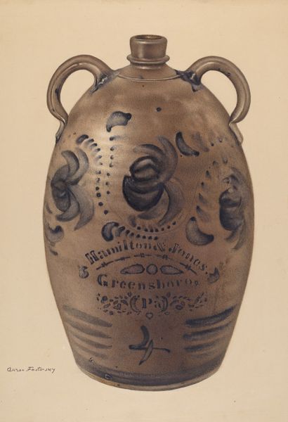 Giacinto Capelli made this drawing of a jug sometime between 1855 and 1995, using what looks like watercolor. The blue floral design against the brown of the jug is striking, almost like a tattoo on pottery. The texture in the brown suggests that this jug may have been around for a while! I’m drawn to the dark blue marks, confident strokes that suggest a fern unfurling. It’s not just a decoration; it's like the jug itself is growing. Capelli captures the jug's solidity while hinting at fragility in the floral design. The way he's rendered the glaze, you can almost feel the smoothness of the ceramic under your fingertips. It’s as if Morandi decided to take up pottery illustration! There's a quiet beauty in how Capelli transforms an everyday object into something extraordinary. It makes you wonder about the stories this jug could tell.