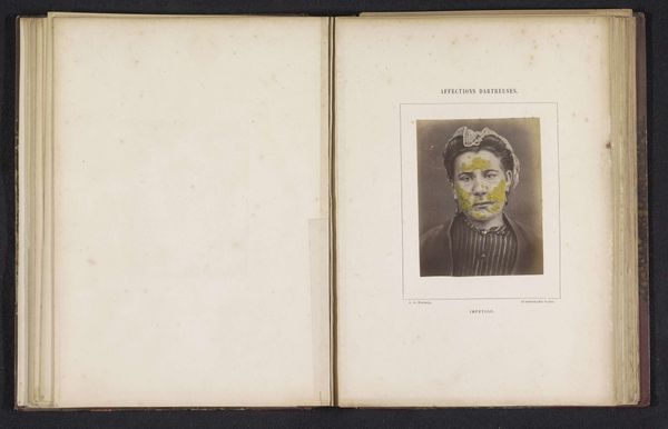 Editor: This is a page from a medical book, featuring a print titled "Portret van een onbekende man die lijdt aan favus op het hoofd," or "Portrait of an unknown man suffering from favus on the head," made circa 1860-1868 by A. de Montméja. It's…unsettling. The yellow scabs on his head contrast sharply with his otherwise somber expression. What do you see here, beyond the immediately obvious medical context? Curator: The yellow, you say. That resonates with me, recalling historical uses of yellow to signify the ‘other’ or the diseased within communities, marking individuals with a visible symbol of their ostracization. Do you think that association holds true here, or is the colour merely a descriptive element, devoid of such cultural weight? Editor: I hadn’t thought of it that way, but it adds another layer to the portrait. It makes me wonder if the man was aware of how society perceived his condition and himself through that. Curator: Exactly! Favus, being a visible ailment, likely transformed the subject’s public identity. This image then becomes a cultural artifact capturing not just a medical condition, but also the psychological impact of disease, mirrored in social perceptions. How do you think that changes our viewing experience? Editor: It makes me consider the weight of symbols—in this case, the colour, the visual sign of the disease. It shows that these visible symbols deeply affect our understanding and interactions. It reminds me to look beyond what’s immediately presented. Curator: Yes, these older images ask us to confront uncomfortable truths, prompting self-reflection on how societies treat those marked by difference or disease. Perhaps seeing such stigmatization makes one sensitive and hopefully, to some degree, prevents similar practices in the present.