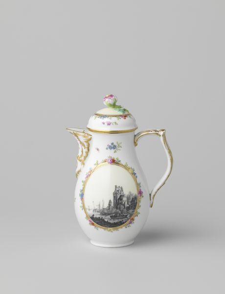 Curator: What a curious object! It’s like holding a tiny, ornate world in your hands. Editor: Yes, this charming rococo-style teapot is circa 1780 and is considered decorative art of ceramic and painting medium. Notice the fine details in the painting with delicate colors? There's something deeply comforting about the landscape, isn't it? Curator: The juxtaposition between the hardiness of a landscape and the everyday-ness of this teapot is compelling! It's more of an escape from everyday living instead of just having a hot cuppa, maybe. Editor: Indeed. The painting of the building and a harbor scene framed by this gilded floral garland brings a feeling of grandeur, doesn't it? Almost as if we’re drinking tea with a view, transported to this picturesque coast. Curator: The flowers are more than mere decoration. They evoke a sensory experience that can affect my mood. It shows more the relationship with nature for a cultural moment of gathering. Editor: Exactly, and think about the flower knob on the teapot, where is like another visual symbol of nature. Maybe tea time becomes an invitation to pause, observe, and appreciate the simpler pleasures around us? The imagery invites us to slow down. Curator: It also shows how a little object can create big effects of appreciation! The maker must have infused daily use of things with beauty! Editor: This piece speaks to how intertwined daily life can be when decorated for our contemplation, doesn't it?