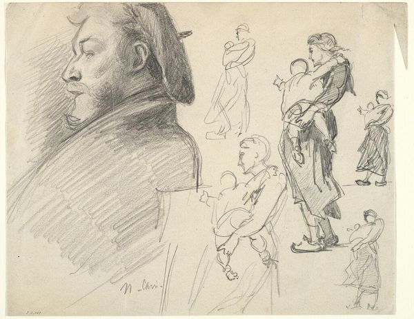 This is a study sheet with three figures by David Bles, made with etching. The artist incised lines into a prepared metal plate, likely copper or zinc, using a sharp needle. The plate was then submerged in acid, which bit into the exposed lines, creating grooves. Ink was applied to the plate, filling these grooves, and the surface wiped clean. Finally, paper was pressed against the plate, transferring the ink and resulting in the image you see here. The etched lines themselves are the essence of the work. The varying depths and densities suggest a sense of light and shadow. The technique allowed for the creation of multiple impressions, making art accessible to a wider audience. This reflects the growing commercialization of art, a world where the artist's skill could be replicated and distributed, influencing a broader social landscape. The act of etching, like any other making process, has imbued this artwork with social and cultural significance.