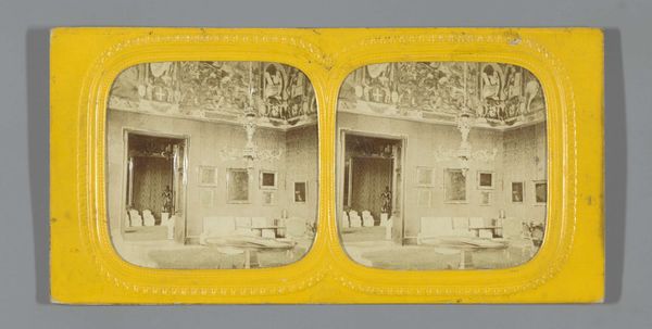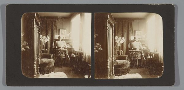 Curator: The photograph here is entitled "Kast in de voorkamer in het huis aan het Singel 256, Amsterdam, Nederland", likely from 1899, by Adrianus Scheltema-Beduin. It’s a view of an interior featuring a rather grand cabinet. Editor: There's a definite melancholy in this image, a faded elegance almost. The lighting certainly contributes, washing everything in a sepia tone, but there’s also something about the composition, the formality, that feels like a preserved moment, a quiet scene in a well-to-do home. Curator: It's interesting to consider the role such cabinets played within the Dutch domestic sphere at the time. They were not just storage; they were displays of wealth, taste, and social standing. Each object carefully placed within to convey the family’s story, their connections to trade and empire. Editor: Absolutely. The cabinet itself is a product of labor. Looking at the carving, you see the hand of the craftsman – likely highly skilled labor but hidden labour – made visible only through the final object now displayed for the consumption and viewing pleasure of the wealthy family. Curator: The decision to document this interior suggests a valuing of domesticity. Perhaps Scheltema-Beduin sought to elevate these everyday scenes to something worth preserving, reinforcing the ideals of bourgeois life through photographic representation. The image also contributes to shaping collective memory and visual codes for constructing national identity through documenting the urban landscape and interiors of homes in Amsterdam. Editor: It also hints at the relationship between art and craft. Consider, photography at that time was itself navigating the question of 'art' status, trying to set itself apart from industrial reproduction and staking its claim within the artistic realm. This image feels part of that negotiation, where photography looks at craft-made furniture inside middle class home. Curator: I see your point, particularly considering how museums were starting to codify aesthetic hierarchies. The photography flattens everything, giving a somewhat equal weighting to the wallpaper patterns and the shape of the cabinet, so the photograph shows all this "domestic display" being captured with then brand new technology of photographic techniques that was not even "high art" yet. Editor: So it is a visual essay about objects and technology within particular social stratum of late 19th century Dutch society. Curator: Yes, a snapshot of social history enshrined in photographic chemicals. Editor: And an intriguing convergence of art, craft, and commerce. Curator: Indeed, making one reconsider what these historical interiors tells us about consumption practices then and now.