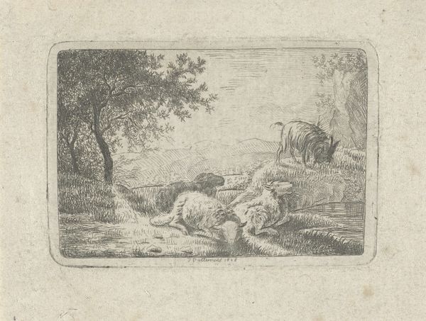 This small etching, titled "Herderin met schapen en een geit," or "Shepherdess with sheep and a goat," is by an anonymous artist. The scene encapsulates a rural idyll: a shepherdess sits outside a humble dwelling, tending to her flock, with her dog loyally at her side. In the absence of details about the artist, the piece invites reflection on the historical perception and romanticization of rural life. The work presents a serene, almost Arcadian vision, but we might ask, what realities of labor and survival are smoothed over in this pastoral scene? Where is the grit and hardship of daily life? Consider, too, the shepherdess herself. Who was she, beyond this idealized representation? What were her aspirations, her daily struggles? This image serves as a reminder to look beyond the surface of representation, to question the narratives that art constructs, and to remember the complex, unrecorded lives that lie behind them.