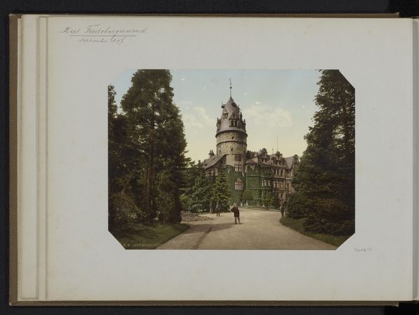 Curator: Let's turn our attention to this intriguing albumen print. Dating from before 1889, it presents "A View of the Estate and House of George Gill Green in Woodbury," attributed to an anonymous photographer. Editor: Wow, it's like stepping into a dream…or a very well-to-do daydream! The soft focus gives it an ethereal, almost nostalgic quality. Curator: That softness aligns perfectly with Pictorialism, a movement which aimed to elevate photography to the status of art by using techniques that mirrored painting and drawing. Notice how the landscape and cityscape elements merge. The residence is the clear focal point of this landscape shot. Editor: Absolutely! And the surrounding garden feels as important as the mansion itself. It’s a symbiotic relationship: grandeur softened by nature. What I find really interesting is how it captures a moment of serenity. I find myself trying to decipher the hidden meanings of prosperity and leisure that radiate here. Does this imagery represent upward mobility or entrenched class privilege? Curator: You touch upon fascinating dualities! Photography in this era served diverse functions, ranging from documentary record to aspirational fantasy. The symbol of a prominent estate might reinforce social hierarchies while offering the tantalizing vision of social achievement. Editor: It is beautiful and a bit melancholic to consider how we view this kind of privilege. Looking at this photograph, I get a powerful feeling for that turning-of-the-century tension between holding onto a quickly fading genteel past and moving full-speed into the industrialized future. The almost excessive ornamentation on that house makes the overall effect even more potent. Curator: An excellent point. Now, when viewed within a cultural studies framework, "A View of the Estate and House of George Gill Green in Woodbury" speaks to complex narratives about wealth, aspiration, and the evolving social landscape of late 19th-century America. It shows how the symbolism of houses carries potent significance to the public. Editor: So, here's to the images that linger long after we’ve looked away! Curator: Precisely. The picture invites more consideration than is initially obvious.