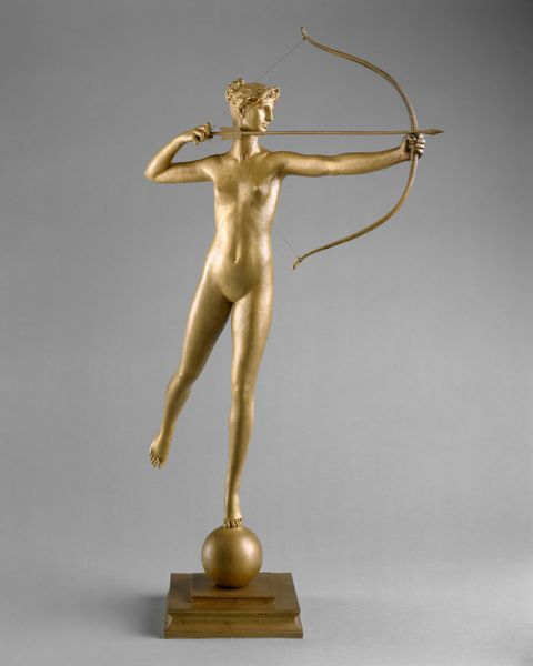 Editor: We’re looking at "Diana of the Tower," a bronze sculpture created by Augustus Saint-Gaudens between 1892 and 1899. It strikes me as both dynamic and elegant; the archer's pose is incredibly graceful. What do you notice when you look at this piece? Curator: Immediately, the sinuous line becomes apparent, dictating the formal relationships throughout the work. Observe how the curve of Diana's bow is echoed in the curve of her body and how those opposing curves set a visual pace to navigate the piece. What is the effect of the archer standing on a sphere? Editor: I think it adds to the sense of motion and precarious balance. It feels like she could take flight at any moment. Curator: Precisely! The orb diminishes mass. Saint-Gaudens seems intent on imbuing a solid, weighty medium with dynamism and lightness. Note also the tension created by the figure being pulled in two directions: forward with her arrow, but balancing back against its pull. Editor: I see what you mean about the opposing curves and the dynamic tension. It is a marvel to behold in a static bronze form. Curator: Indeed, and Saint-Gaudens has created visual echoes—notice how the angles formed by her limbs are repeated? And then you can trace the line from her toe, up the leading leg to the arch, a device that moves the eye and thus animates the figure. Editor: This close analysis has changed my perception! I came in with a sense of beauty, but now I see a sophisticated study of opposing lines and dynamic forces at play. Curator: I trust your engagement with it now includes more than simply emotional admiration; instead, a developed appreciation of how all of its artistic qualities, visual structure, and materiality play to the same purpose.
