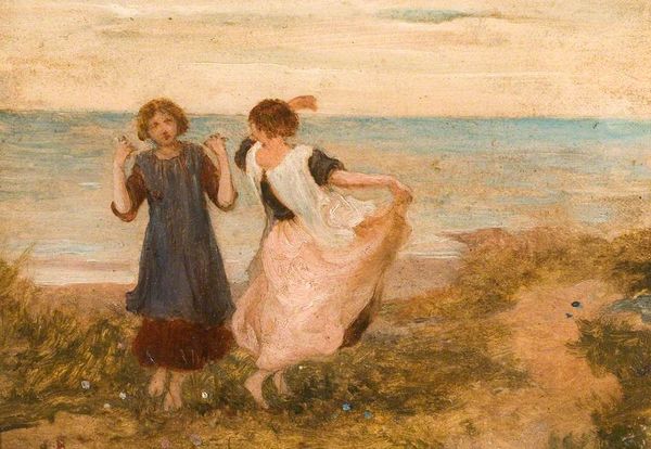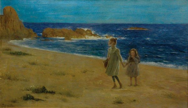 Curator: Charles Conder painted this scene, *Spring by the Sea,* but we aren’t sure exactly when it was made. The canvas measures about 50 by 92 centimeters. It’s at the Tate, made with oil. Editor: It’s incredibly dreamy, isn't it? Ethereal, like a half-remembered myth. The colours are soft, and everything seems bathed in a gentle light. Curator: Conder engaged with the aesthetic movement, valuing beauty and artistic expression above all else. You can observe how the use of oil paint allowed him to blend colors smoothly, creating this hazy effect. Editor: It feels like a moment suspended in time, a gathering of nymphs perhaps, caught in a fleeting reverie. The women seem to be present but also somehow distant, lost in their own world. Curator: Conder's use of classical figures within an Australian landscape reflects the cultural exchange happening in the late 19th century. Editor: I can almost feel the cool sea breeze and hear the soft murmur of the waves. It's a world I want to disappear into. Curator: That's a great way of looking at this picture. Editor: Yes, it just goes to show the power of capturing those feelings in paint, doesn’t it?