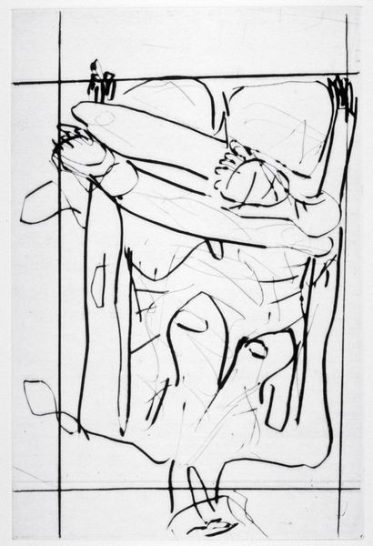 Curator: Looking at this etching from 1921 by Béla Czóbel, titled "Czóbel Béla Rázkarc", I am immediately drawn to its intense lines and contrasts. It feels very raw. Editor: Yes, that intensity really hits you. It has such a melancholic air. It feels like a poignant observation on a fragile interior state. The lines vibrate. Curator: The symbolism is evocative, isn't it? The delicate rendition of the figure beside what appears to be a birdcage calls forth all sorts of thoughts on captivity and longing. The art-nouveau style also leans into the use of allegorical forms, here maybe about desire and limitation. Editor: It’s interesting how the gaze of the subject, and the direction of the caged bird both are oriented right. This builds a strong symbolic directionality. What’s the history behind Czóbel’s prints like this one? What made them possible? Curator: This was during the interwar period, which, culturally, meant a turn inward and away from bold statements of pre-war movements, which is visible through the prevalence of portraiture as a style during that time. But look closer, the etched marks that form the image—they evoke not just the era's pensive mood, but maybe also psychological interpretations related to social changes and norms imposed, as if mapping anxieties directly onto the copperplate, so to speak. Editor: You are right, it is interesting how such personal symbols engage with bigger ideas. Perhaps there are direct socio-cultural forces impacting on private realities: this piece reveals cultural anxieties about entrapment through visual language. There’s something quietly political in that vulnerability made so publicly available through distribution as a print. Curator: Exactly. I think both elements combine—personal symbolism and social history, culminating to a quite thought-provoking emotional encounter in front of this print. Editor: For me, this etching reveals how vulnerability became a valid artistic and aesthetic position, where exposure and emotional sensitivity became, perhaps, forms of social agency and resilience, both for the figure depicted in the image, as well as the artist. Curator: Ultimately, this artwork prompts us to delve into questions around self-representation in unsettling historical conditions.
