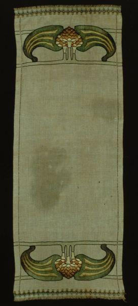 Editor: This object, "Towel or Napkin" from the 19th century, artist unknown, resides at the Art Institute of Chicago. The weaving and fiber art construction give it a unique textile quality. It feels incredibly intimate, almost domestic, despite being behind glass. What structural aspects particularly strike you? Curator: The first thing I note is the symmetry, immediately destabilized by the random spattering across the main field. This juxtaposition creates a powerful tension. Observe how the decorative borders at the top and bottom employ repetitive floral motifs, typical of decorative arts during this period, which contain a Romantic essence with it’s repetitive pattern. Editor: So the appeal really comes from the surface itself— the pattern struggling against the... marks? Curator: Precisely! These seemingly random imperfections offer a disruption to the imposed symmetrical composition of decorative-art. They interrupt what could be read as the intention toward ideal perfection, speaking volumes about process and use over time. Note, too, how the artist, or craftsperson, uses these framing embellishments and then allows space for a visual incident to take hold within the central rectangle. How does that space speak to you? Editor: I see now how it introduces a visual language beyond mere decoration! The ‘accidental’ qualities emphasize intention and material. It really challenges what I previously thought about Romanticism, and brings a completely new perspective of decorative-art. Curator: Indeed! By analyzing these structural elements, we've moved beyond simple aesthetics and uncovered some intricate visual dialogues. The piece has more to tell us.