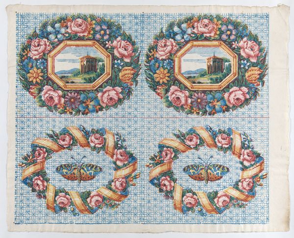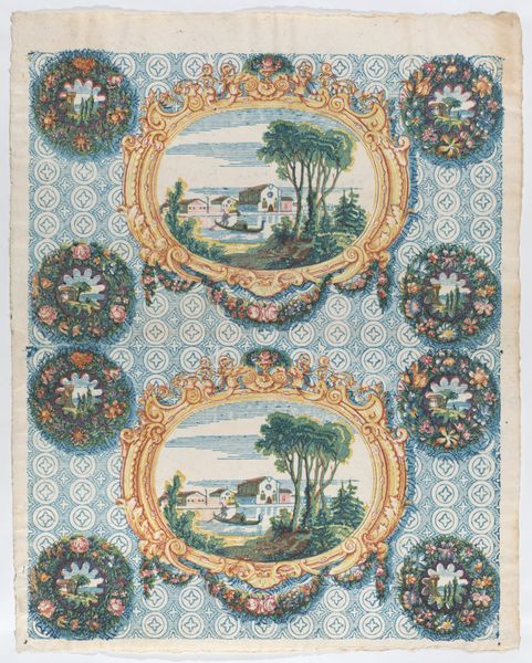 Curator: This is a sheet of printed designs dating from somewhere between 1775 and 1875, held here at the Met. It's known as "Sheet with two borders with landscapes and moths within wreaths." Editor: My immediate reaction is of intricate balance. The symmetry in the patterns—wreaths of flowers enclosing either a landscape or a moth—is really quite captivating, a structured garden. Curator: It does harken back to Romanticism, which valued subjective experience and the beauty of the natural world. We must remember, printmaking like this served a real social purpose at the time. Wallpaper and printed ephemera became accessible to broader audiences, changing interior decoration trends for those who could afford it. Editor: Precisely, and it’s this contrast that makes the piece compelling. The floral wreaths and delicate wings possess such grace, then they are geometrically distributed on this grid, which feels like such a deliberate composition—a tension created through contrasting the organic with the grid. Curator: Consider too the architectural scenes. Are these simply pleasant vistas, or statements of societal ideals? Printed images, affordable and distributable, were key tools for disseminating ideals of landscape and proper environment. Editor: Look at the hues themselves—a pastel spectrum with blue underlying every shape which feels at once lighthearted but somewhat restrictive. The very form in fact is restricting these colorful wonders. It's almost taxonomic. Curator: Yes! Perhaps the creators aimed to illustrate and classify the natural world through this artistic lens. Did it educate, inspire, or simply please the eye? Most likely all of the above. Editor: And its beauty is as interesting as its function. Thank you for revealing the rich historical context behind such visually pleasing designs! Curator: My pleasure, your analysis reminds me how the convergence of aesthetic appeal and socio-cultural history shapes art's enduring appeal.