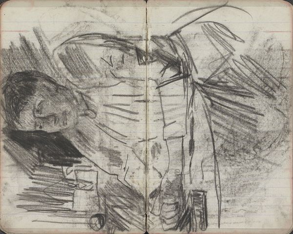 George Hendrik Breitner created this charcoal sketch, "Portret van een onbekende vrouw," which now resides in the Rijksmuseum. The rough texture and monochrome palette create a sense of immediacy, as though we've caught a fleeting moment. The composition, spread across a double page, is divided yet connected by the spine. On the left, the woman's face is rendered with dense, energetic strokes that capture her profile with somber intimacy. To the right, the lines become more fragmented, almost abstract. The linearity on the right contrasts with the mass of charcoal, leading to a semiotic play between presence and absence. Breitner's structural approach to form mirrors early 20th-century concerns with representing modern life. The drawing destabilizes traditional portraiture by emphasizing the raw materiality of the medium. The artwork challenges our perception of representation, blurring the line between the subject and the artistic process.