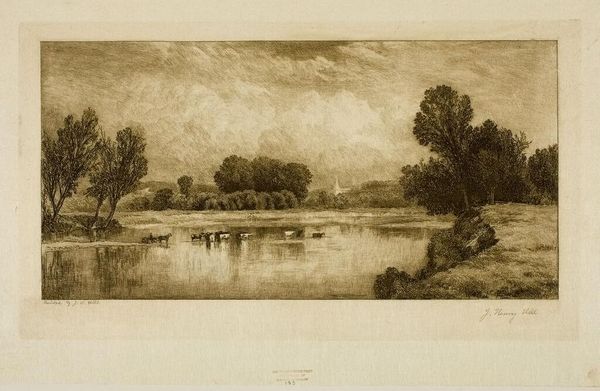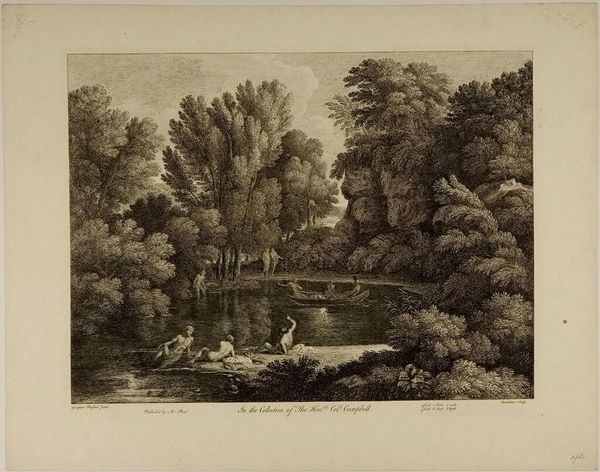 Curator: This is Louis Marvy’s "Landscape," currently residing here at the Harvard Art Museums. Editor: It strikes me as intensely Romantic. Look at the layering of light and shadow, the pastoral gathering in the background. Curator: Observe how Marvy manipulates tonal values to create depth. The surface of the water, its dark reflectiveness, it is key to understanding the work. Editor: Indeed. Consider also, though, how the rise of the bourgeoisie allowed for leisure and thus scenes such as these became marketable. Curator: The subject is secondary to the composition. The balance between the trees on either side, the centralized water, it all lends to a sense of idyllic order. Editor: I wonder, though, about the accessibility of such scenes and whether Marvy critiques or celebrates the social climate. Curator: Interesting! It’s the formal arrangement of elements that captivates me most. Editor: And I, the social implications of such arrangements.