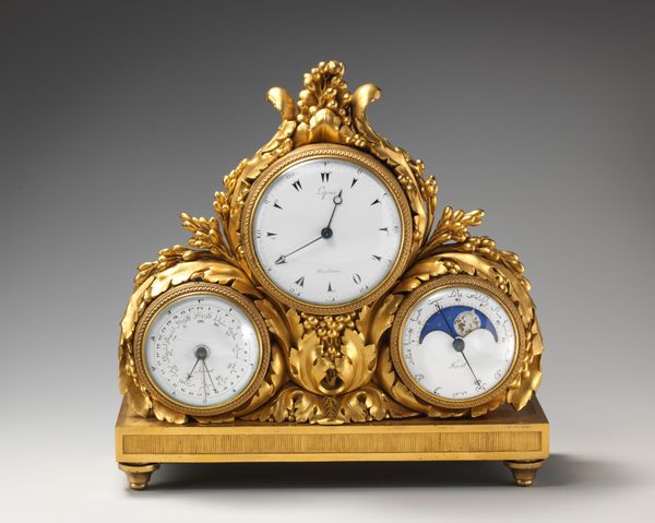 Curator: Here we have a table or bracket clock created between 1770 and 1780, now residing at the Metropolitan Museum of Art. It's attributed to Christopher Pinchbeck II, showcasing his craftsmanship in metal and wood. Editor: My first impression is how wonderfully opulent this object is. It immediately strikes me as a powerful symbol of wealth and status. All of that bright gilding really catches the eye, doesn’t it? Curator: Absolutely. The materials alone would have been costly. Looking closer, the Rococo influence is unmistakable. These objects signaled taste, knowledge, and connection to fashionable elite circles. Notice the casework itself—an expertly made miniature architectural object, designed to showcase elaborate mechanics. Editor: The cherubic figures at the clock's face suggest themes beyond mere timekeeping. Are they indicators of earthly and heavenly time or perhaps symbols representing family, status or posterity? Time itself had tremendous cultural symbolism at this moment. Curator: It's more complex than simply telling time. Remember that clocks of this era were significant social markers, visible in the homes of those who shaped political and economic events. Owning such an elaborate timepiece declared a certain position in society and allegiance to a refined culture, a status marker. The mechanics themselves often involved political debates of science and industry. Editor: The case also reminds us that domestic spaces were carefully crafted stages for performing status. This object was surely meant to be seen, admired, and to serve as a silent testament to its owner's position. It feels very intentional. It even has its own portable shelter. Curator: Precisely! Pinchbeck capitalized on these demands with pieces blending artistry and function. His clocks entered specific settings and supported ongoing stories of political, social, and economic authority. They became both tools and treasures. Editor: When you view it through that socio-historical lens, it casts an intricate symbolic shadow on society. Time wasn't just a measure, but also a mirror reflecting personal and collective ambitions. It still sparks reflection on how much has changed – and what surprisingly remains. Curator: Indeed. Reflecting on this artwork reveals both the ambitions of an era and the fascinating power of objects within it.